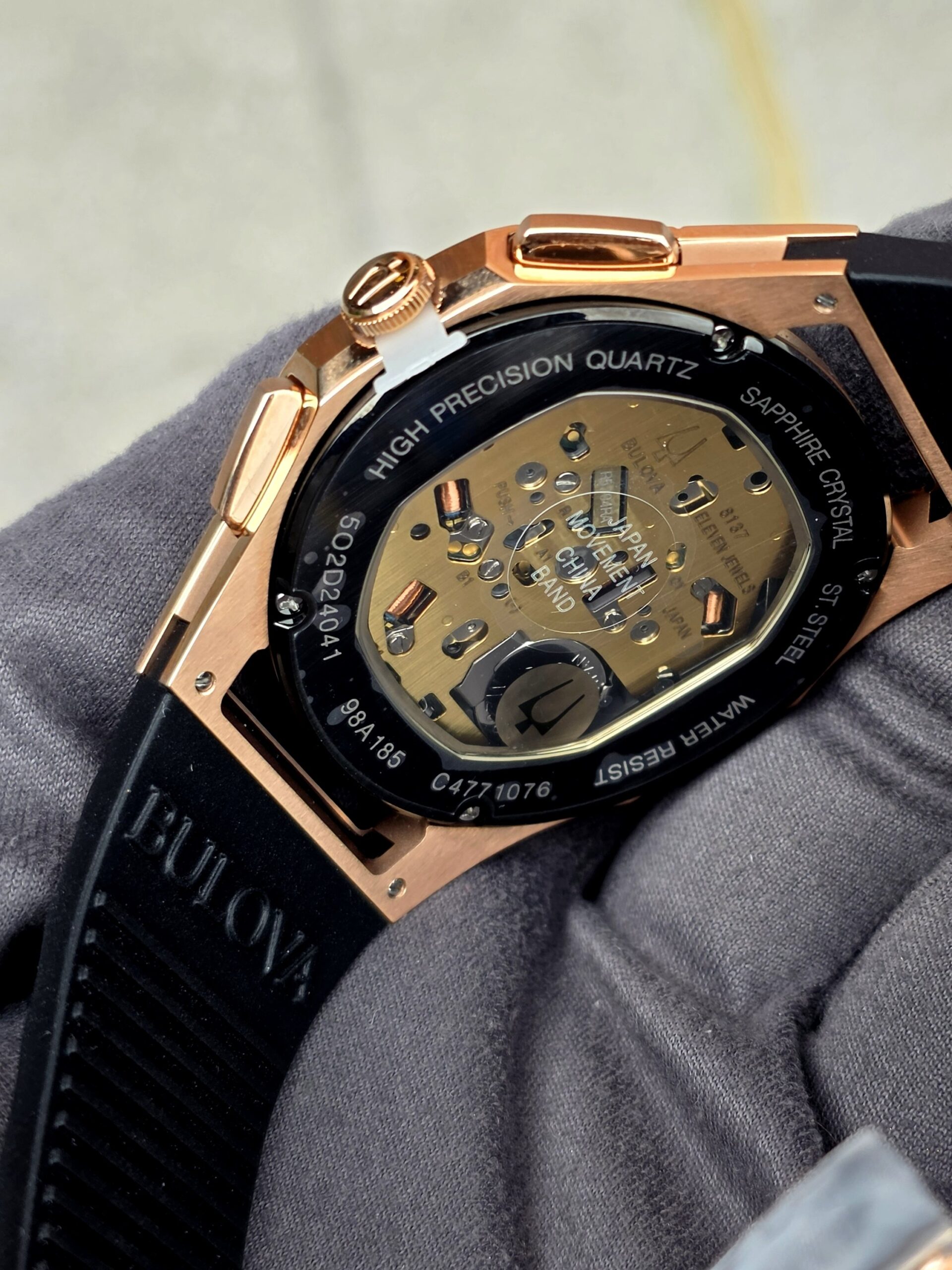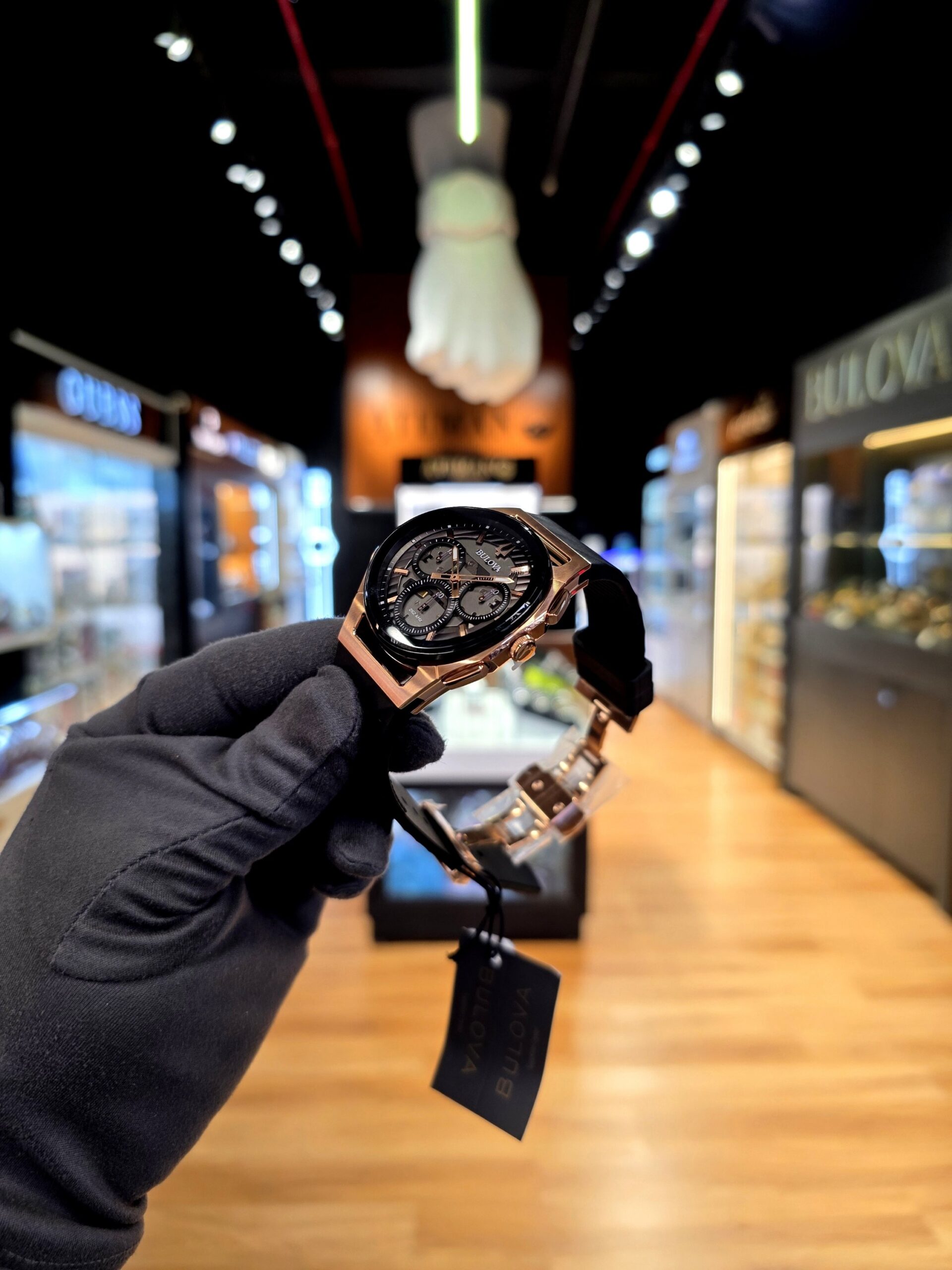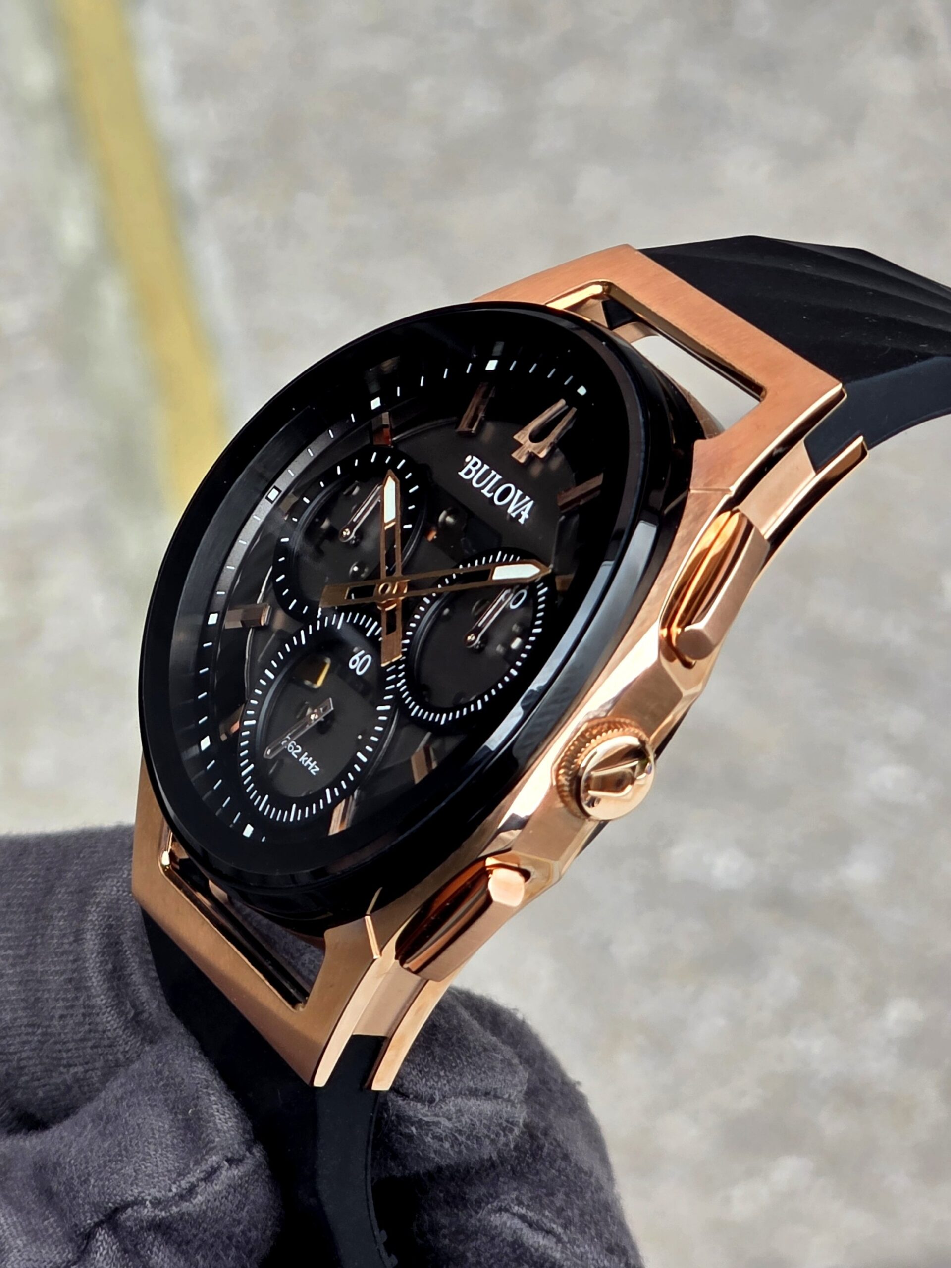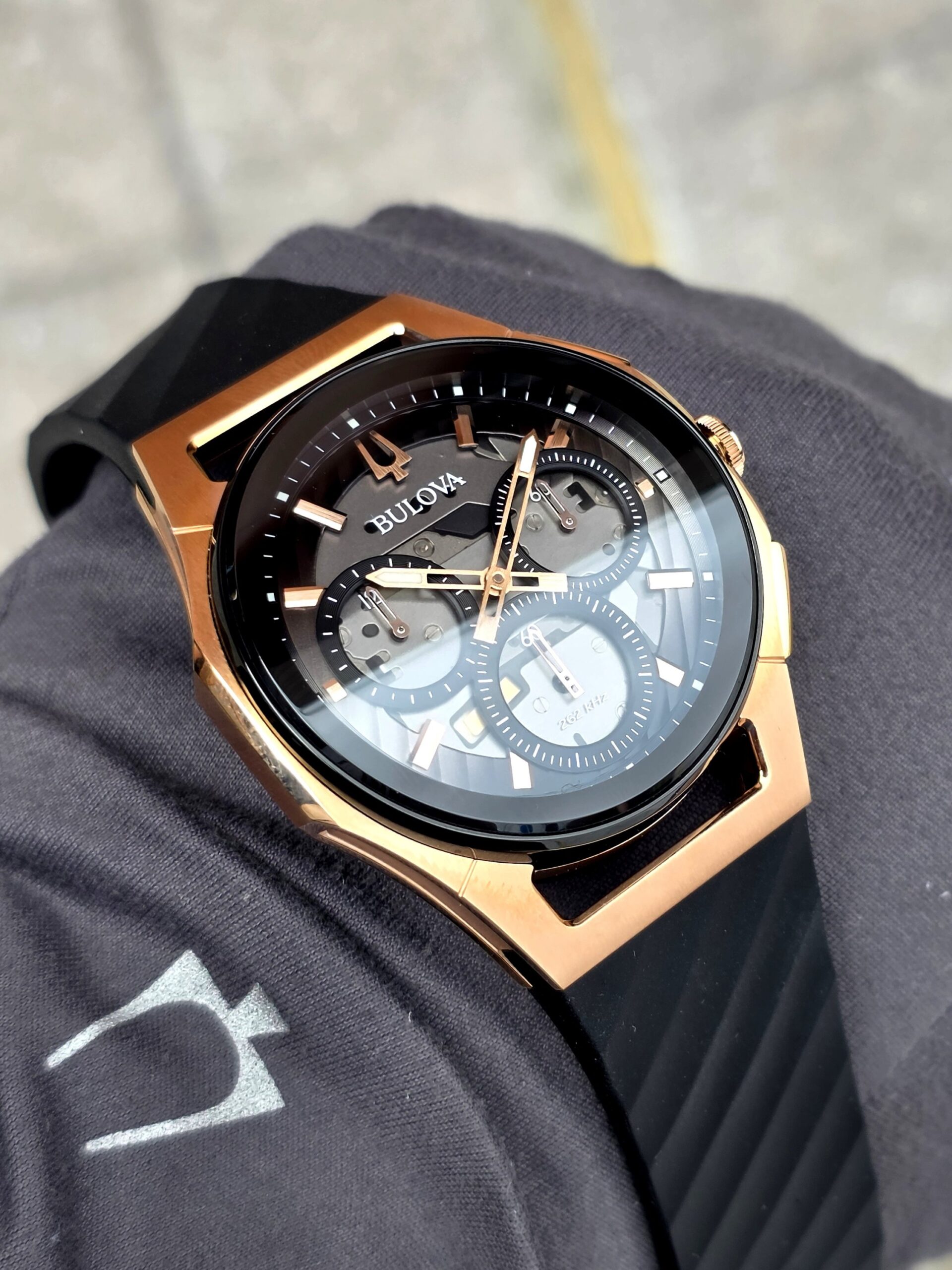 De la Colección CURV. El primer movimiento de cronógrafo curvo del mundo cuenta con tecnología patentada de cuarzo de alto rendimiento con frecuencia vibratoria de 262 kHz para una precisión precisa. Cronógrafo de cinco manecillas en caja de acero inoxidable en tono oro rosa y bisel negro, fondo de caja de exhibición, esfera negra con manecillas y marcadores en tono oro rosa, cristal de zafiro curvo antirreflectante, caja a rosca, correa de caucho EPDM negro y resistencia al agua a 30 metros.