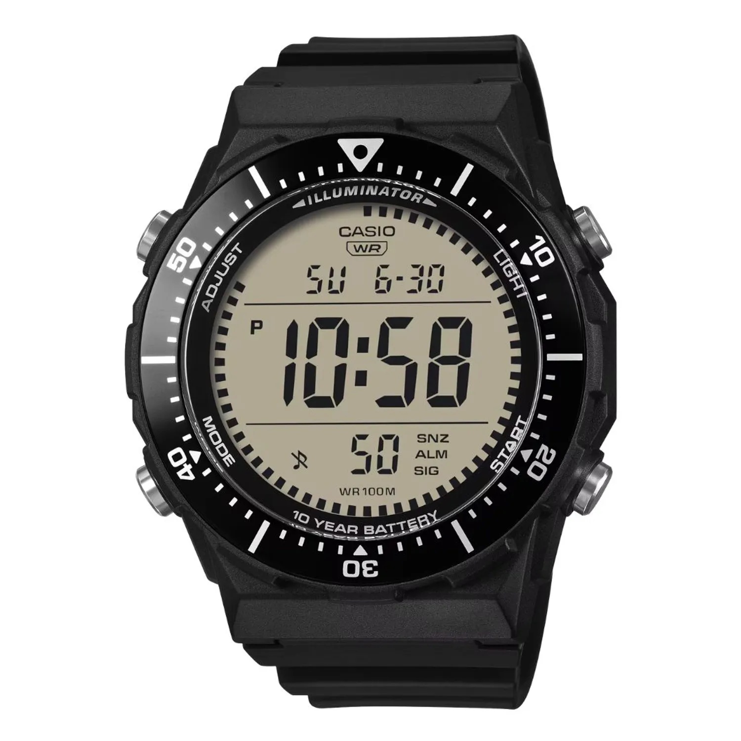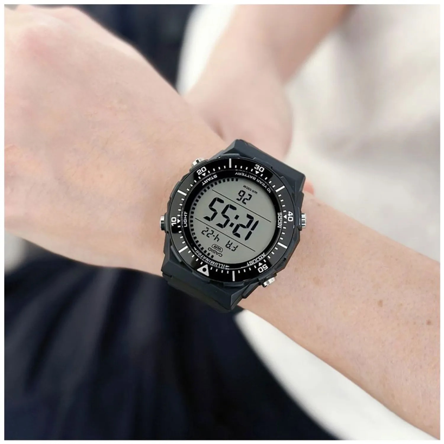 Un reloj digital multifuncional con una amplia pantalla de fácil lectura y bisel giratorio, perfecto para el mundo del deporte. Resistente al agua hasta 10 bar, diez años de duración de la batería, retroiluminación LED, así como prácticas funciones como cronómetro, alarma y mucho más.