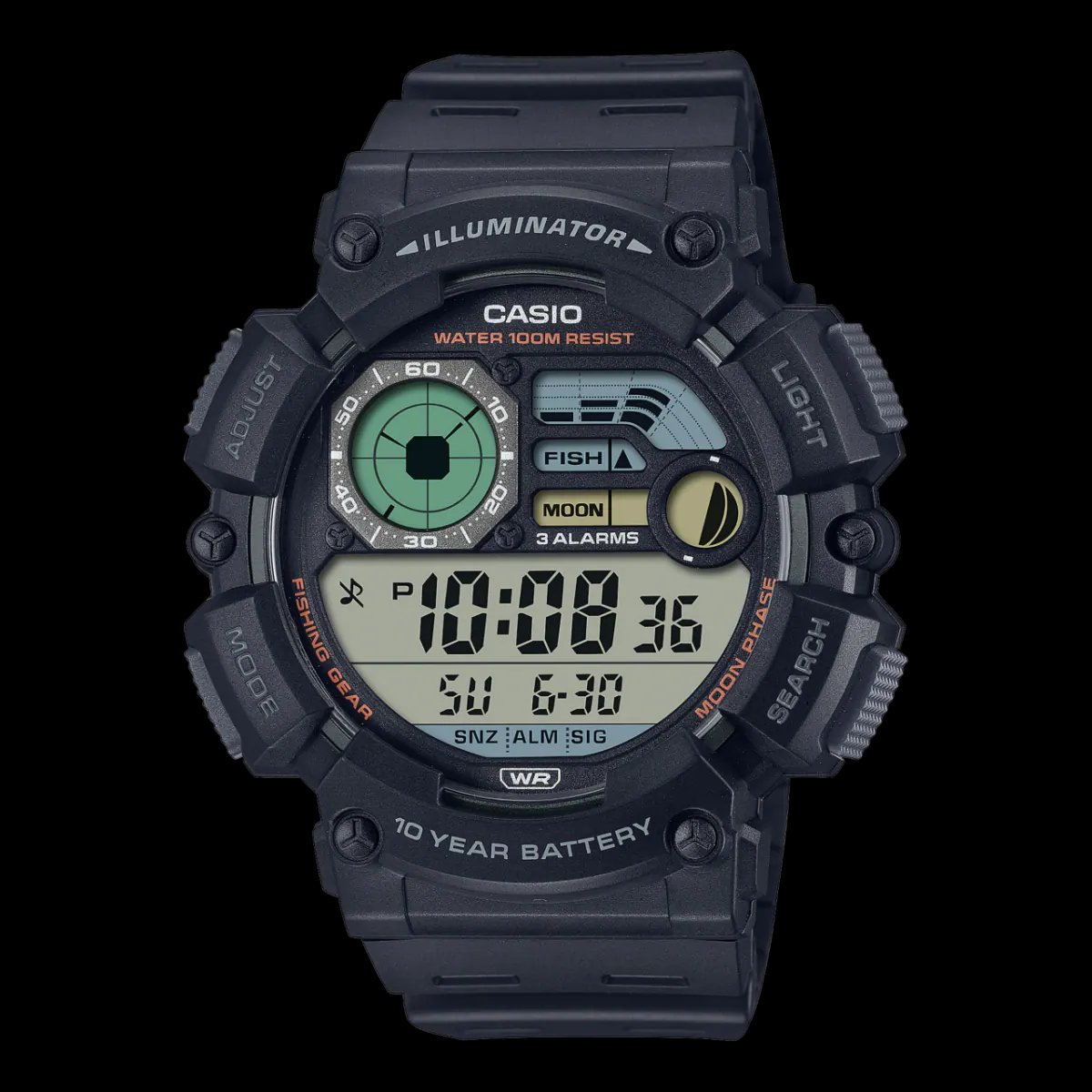 Satisfaga sus necesidades de estilo y practicidad gracias a una fórmula audaz en un reloj digital multifuncional con un diseño de tamaño generoso fácil de leer. Estos relojes están siempre listos, gracias a una batería de 10 años, resistencia al agua de hasta 100 metros, luz LED y pantalla de hora dual. Los indicadores de fase lunar y nivel de pesca le ofrecen justo lo que necesita cuando está fuera del agua.