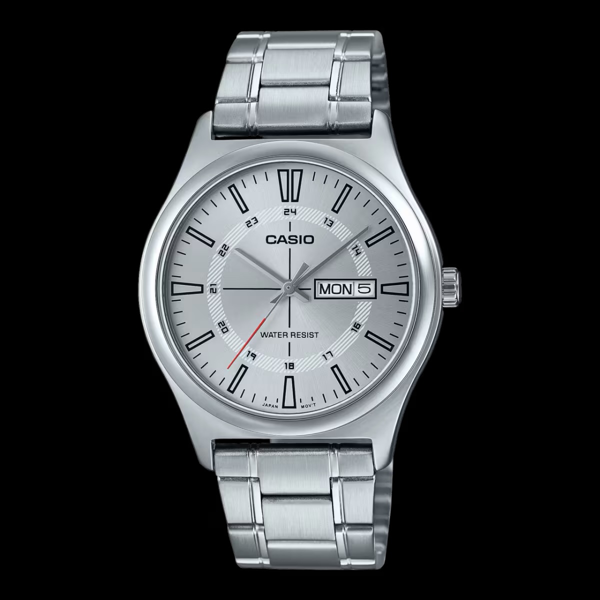 Las sencillas y elegantes marcas de índice en forma de barras y el práctico visualizador de fecha y día en la posición de las 3 en punto ofrecen un diseño elegante y una comodidad funcional. La resistencia al agua para uso diario lo libera de las preocupaciones cuando está bajo la lluvia o lava sus manos.
