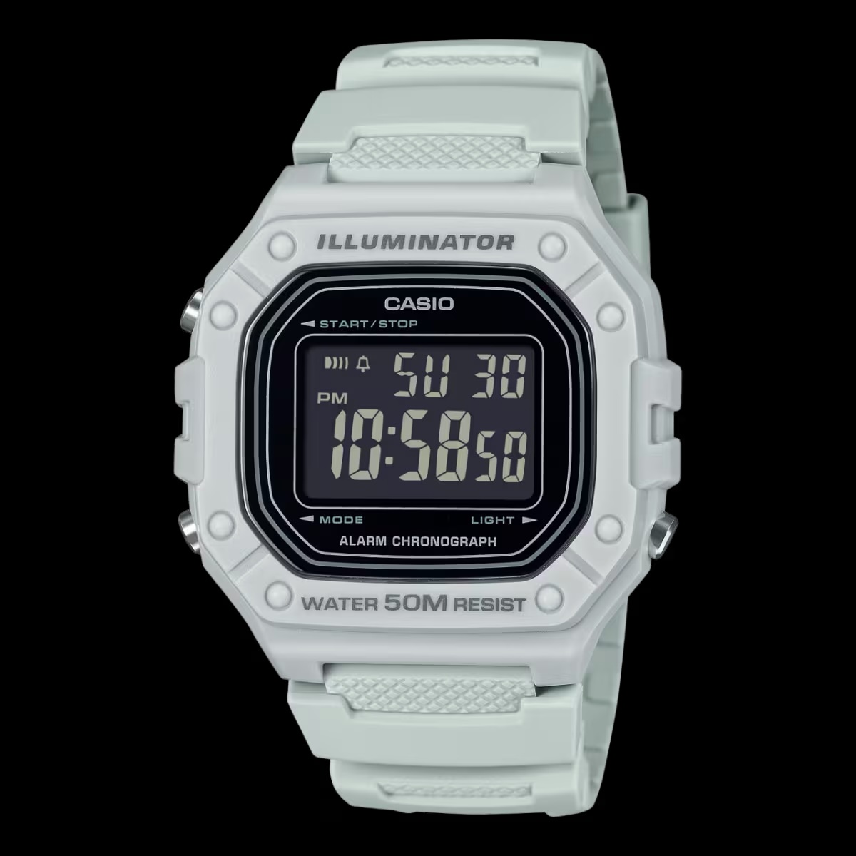 Con agujas blancas, bisel plano y una pantalla LCD que muestra fecha, día y hora mundial, combina precisión técnica con un diseño limpio. Resistente al agua hasta 100 m.