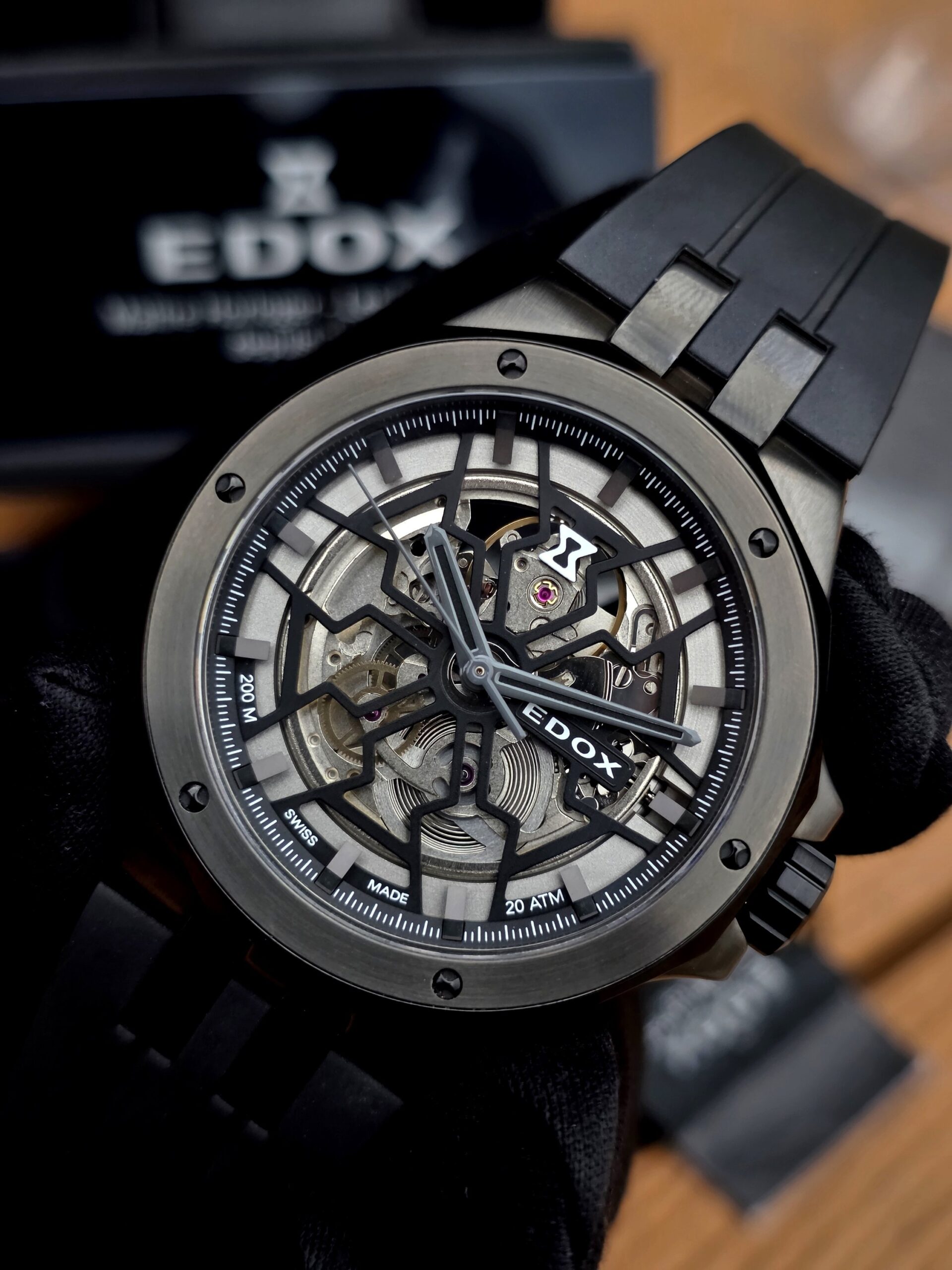 Características: Corona y/o pulsador Edox con doble junta tórica , Corona y/o pulsadores atornillados , Fondo de caja transparente