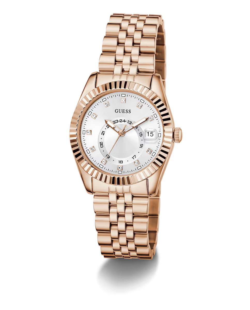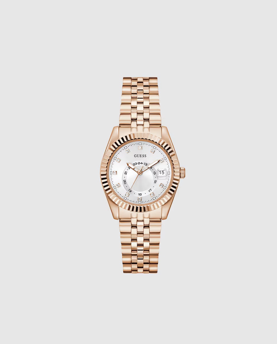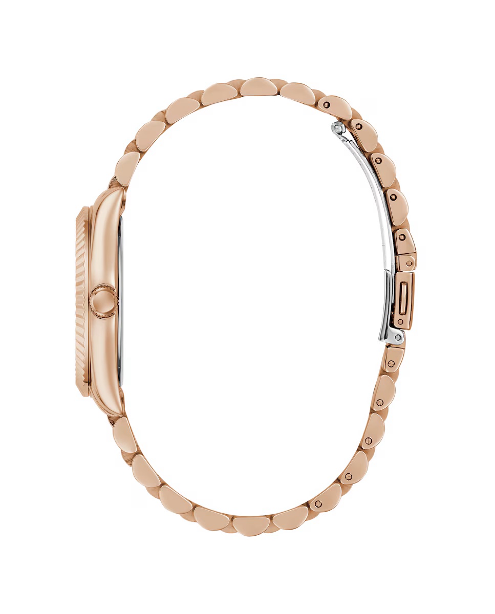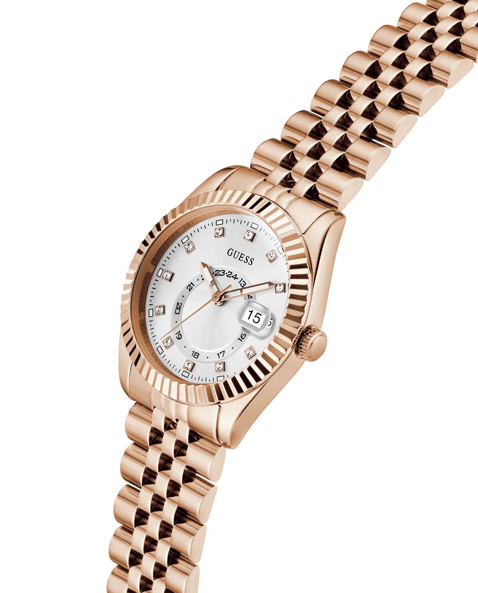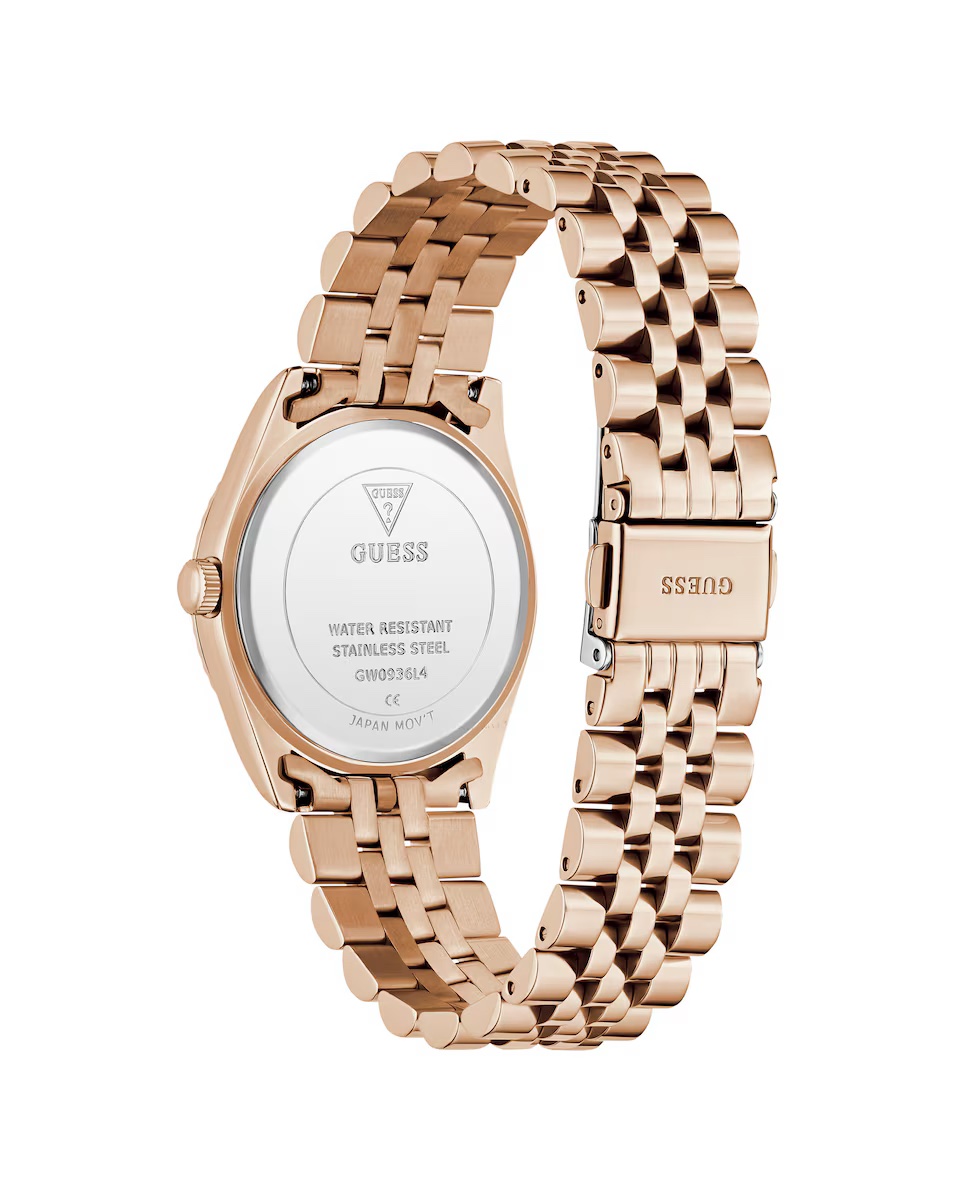 Reloj de mujer Jada GW0936L4 de acero y correa oro rosa. Reloj de mujer de la marca Guess con caja de acero reciclado brillante de 34 mm oro rosa con detalle de bisel de moneda dorado, esfera de iridiscente blanca con fecha y 24 horas y brazalete de acero reciclado brillante oro rosa. Un look sofisticado y contemporáneo que combina brillo y elegancia con un toque de frescura