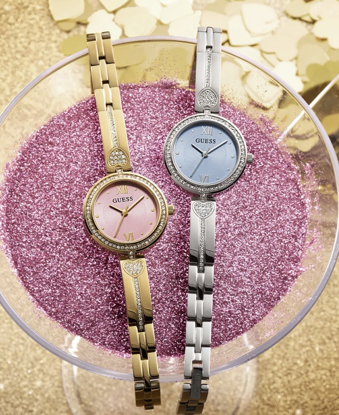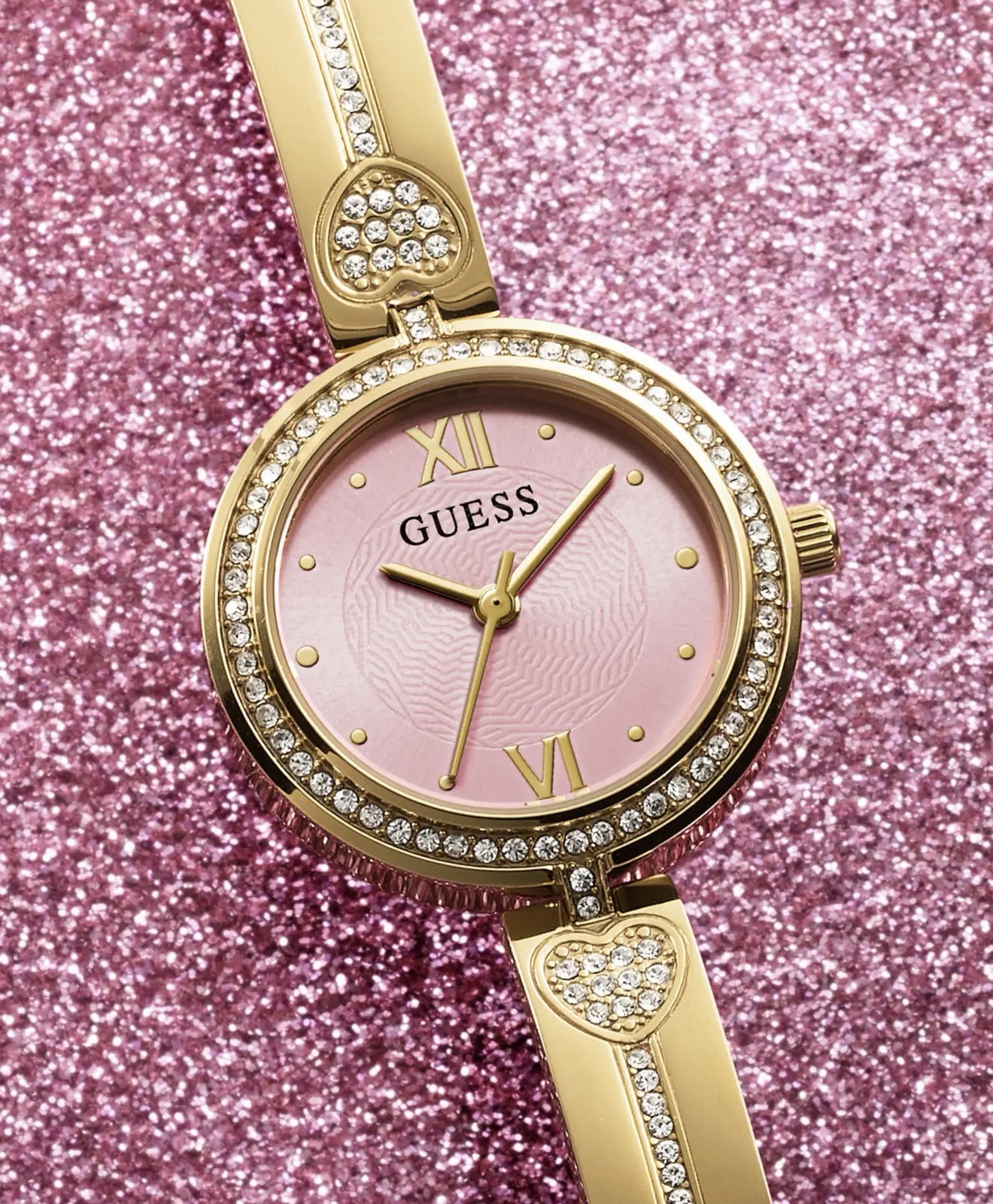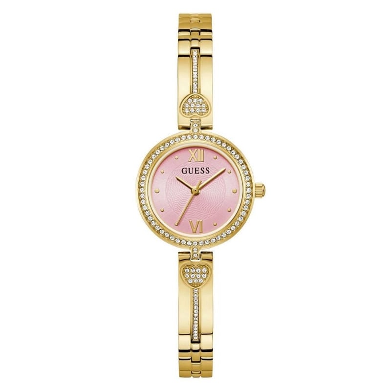 reloj analógico para mujer Guess Lovey, un accesorio de diseño joya que destaca por su esfera rosa y detalles con cristales.