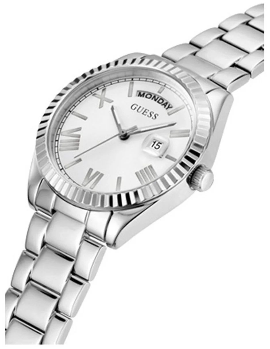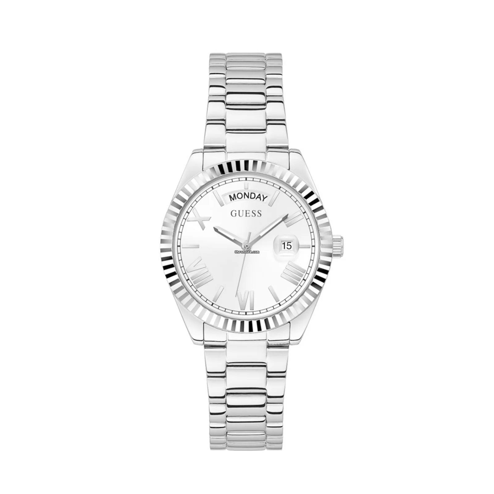 Un look clásico con un toque. Este bisel de cristal completamente adornado está integrado con un brazalete pulido de 3 eslabones y presenta una ventana del día de la semana a las 12 en punto con una fecha de burbuja a las 3 en punto.