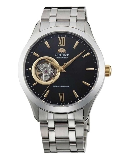 El Orient TAG03002B destaca por su diseño contemporáneo con una elegante esfera negra realzada por agujas y marcadores dorados, creando un contraste sofisticado y moderno. Su construcción en acero inoxidable y su detalle de vista parcial del mecanismo lo convierten en una pieza ideal para quienes buscan estilo y precisión en un solo reloj.