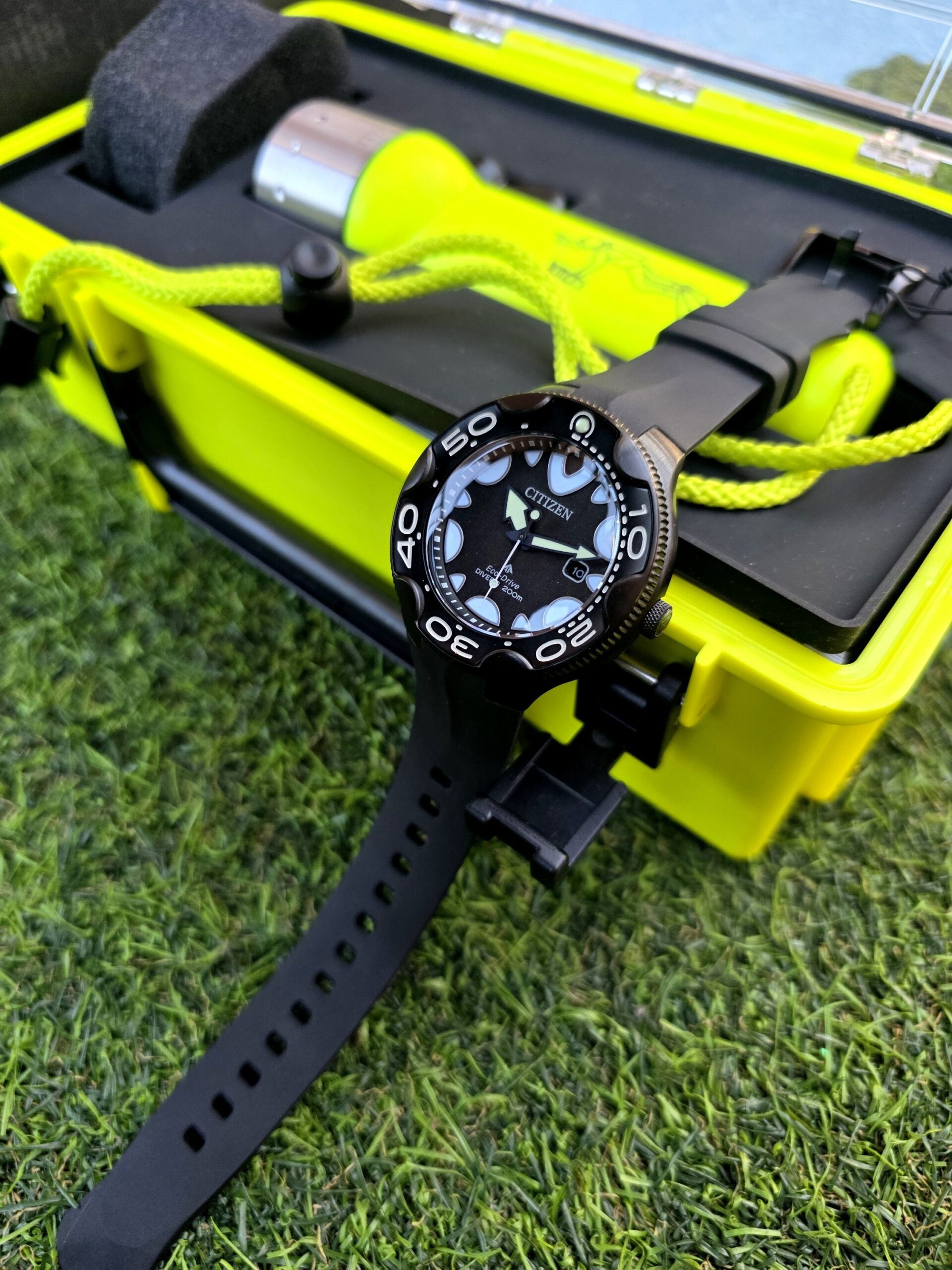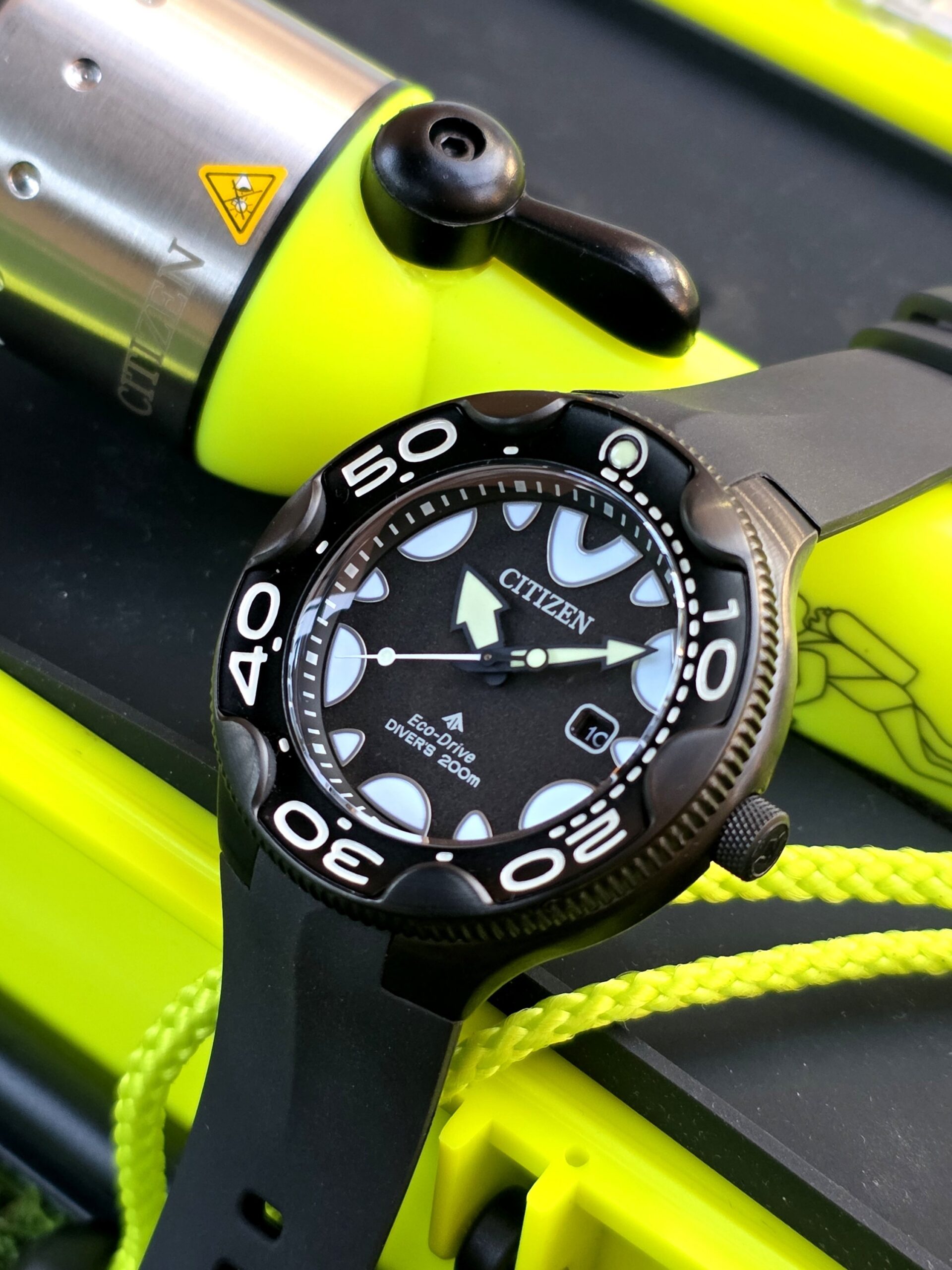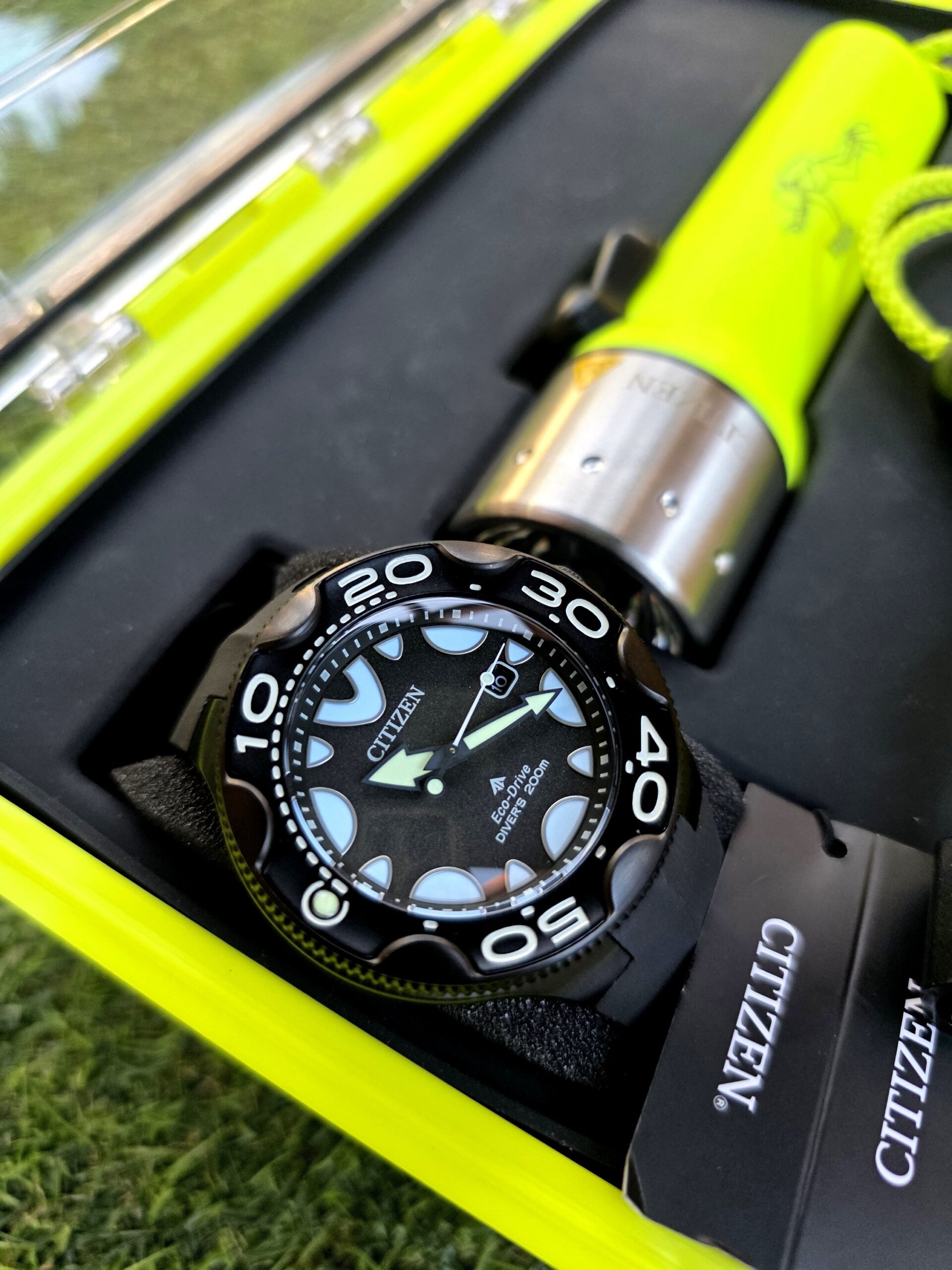 Con certificación ISO para buceo, este reloj anti magnético cuenta con resistencia a golpes, un bisel unidireccional con aro de aluminio y manecillas e indicadores luminosos para una mejor lectura. La correa de poliuretano negro imita la forma de la aleta de la orca y se abrocha con una hebilla. Su corona enroscable y resistencia al agua hasta 200 metros lo convierten en el acompañante perfecto para tu siguiente inmersión. Viene en una exclusiva caja coleccionable en forma de tanque de buceo. Alimentado sosteniblemente por cualquier tipo de luz gracias a nuestra tecnología Eco-Drive, nunca necesitará de baterías. Calibre E168.